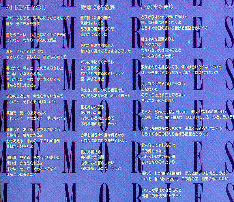 Although I look terrific in the choicest fashions time is quietly passing Soon the starlit sky that signals the end of today will glitter Rather than hasty words Groping love What I don't understand is myself Small puddle of the heart Tears shake the surroundings We don't want to hurt each other, but we won't be able to become a blissful carefree couple I don't try to look cool I worry [...?] Small puddle of the heart |