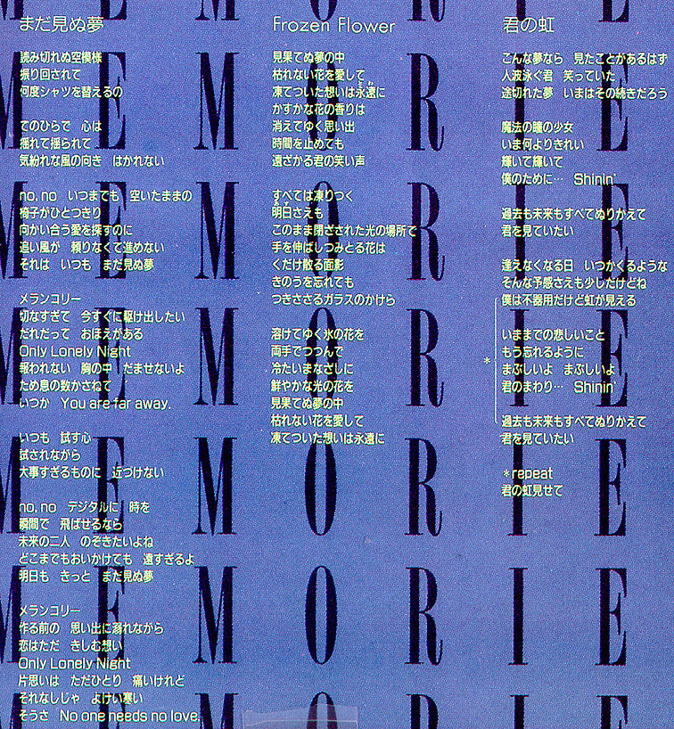 In an unfinished dream I love an unwithering flower my frozen feelings will last eternally The faint scent of the flower is a fading memory Even if I stop time your laughter grows ever distant Everything is frozen Even the coming day Cut off in this place of light the flower I reach my hand out for is a shattered, scattering memory Even if I forget yesterday these shards of glass still pierce me [RECORDER SOLO] I embrace with both arms this melting frozen flower With cold eyes I stare at this flower shining brilliantly In an unfinished dream I love an unwithering flower my frozen feelings will last eternally |